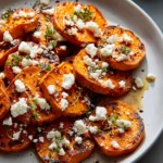 - Once the sweet potatoes are roasted, remove them from the oven and sprinkle crumbled feta over each round.