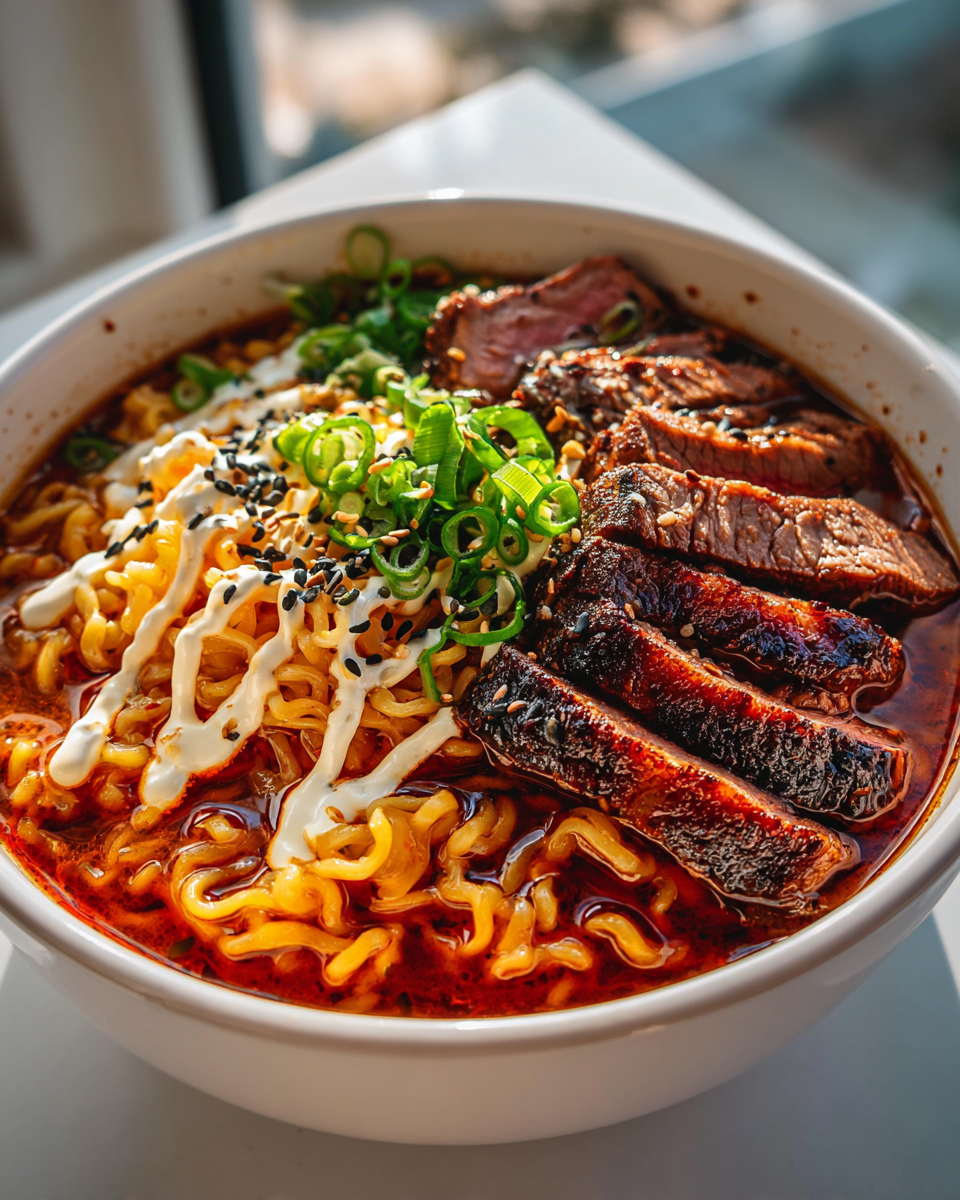 Spicy Korean Ramen with Grilled Beef & Creamy Sauce Recipe