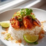 - Finish and Serve: Remove the chicken from heat and fluff the coconut rice. Divide the rice among bowls, top with chicken, drizzle extra glaze, and garnish with cilantro, green onions, sesame seeds, and a squeeze of lime juice.