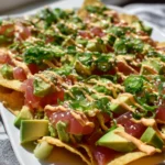 Experience the ultimate snack with these Tuna Nachos Deluxe, featuring marinated sushi-grade tuna and fresh toppings on crispy tortilla chips. Perfect for game nights or a quick treat, this recipe is sure to impress your guests!